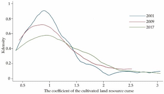 Kernel density distribution of the cultivated land resource curse coefficients for the county-level administrative regions in Jianghan Plain.