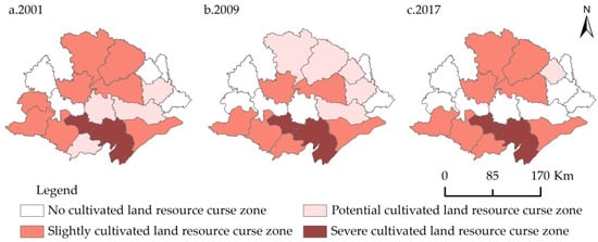 The severe cultivated land resource curse zone had remained unchanged. This zone consisted of Jiangling and Jianli. The size of the slightly cultivated land resource curse zone first decreased and then increased from eight regions (Zhongxiang, Jingshan, Tianmen, Shayang, Zhijiang, Songzi, Gongan, and Honghu) in 2001 to six regions (Tianmen, Shayang, Honghu, Songzi, Gongan, and Shishou) in 2009 and eight regions (Zhongxiang, Jingshan, Tianmen, Shayang, Shishou, Songzi, Gongan, and Honghu) in 2017. The size of the potential cultivated land resource curse zone increased first and then decreased from four regions (Shishou, Qianjiang, Xiantao, and Hanchuan) in 2001 to five regions (Zhongxiang, Jingshan, Yingcheng, Hanchuan, and Xiantao) in 2009 and one region (Yingcheng) in 2017. The size of no cultivated land resource curse zone gradually increased. The area included Dangyang, Yunmeng, Yingcheng, and Caidian in 2001; Yunmeng, Caidian, Dangyang, Zhijiang, and Qianjiang in 2009; and Dangyang, Zhijiang, Qianjiang, Xiantao, Hanchuan, Caidian, and Yunmeng in 2017.