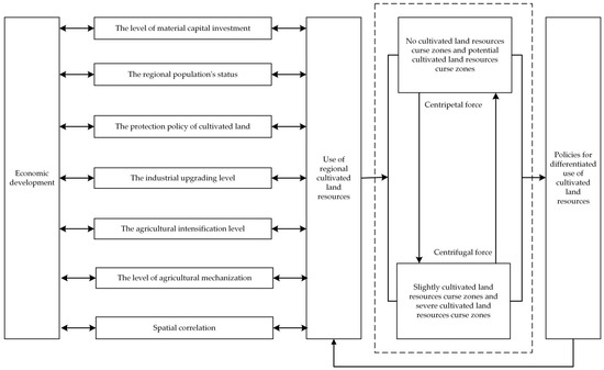 The efficient utilization of cultivated land resources is a critical problem in cultivated land resource utilization and local economic development. This study used the resource curse as a basis to propose the “curse of cultivated land resources.” Thereafter, this research examined the dynamic changes of cultivated land resource curse coefficient and performed panel regression to determine the factors influencing cultivated land resource curse in 2001–2017 in Jianghan Plain, which is an agricultural production area in China. From 2001 to 2017, the curse coefficient of cultivated land resources in Jianghan Plain generally showed a downward trend, whereas the curse phenomenon of the cultivated land resources in large regions did not improve significantly. The influencing factors of the cultivated land resource curse in the different cursed degree areas were different, and the spatial interaction of the cursed degree areas was also different. This research proposed a transmission mechanism of the cultivated land resource curse in Jianghan Plain. Zones with potential cultivated land resource curse and non-cultivated land resource curse had relatively large agglomeration benefits. These regions exerted centripetal force on the capital, technology, labor force, and other factors of the surrounding areas. Other areas were affected by centrifugal force. The interaction of the centripetal and centrifugal forces substantially strengthened the gathering force of the non-cursed zone and considerably developed the economy. Moreover, the non-cursed zone exhibited spillover effects. Policies from throughout the entire and within the main agricultural producing areas, such as those related to increasing financial support for agriculture and strengthening comprehensive agricultural development, were proposed to adjust the cultivated land resource curse.