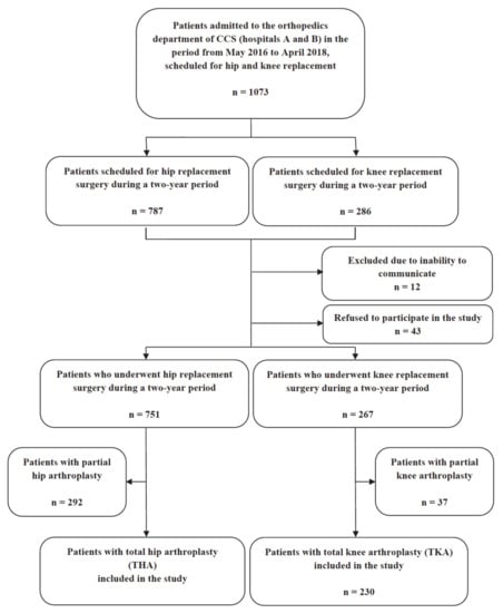 During the study period, 1073 patients were admitted to the Clinic for Orthopedic Surgery and Traumatology, CCS, of which 787 were scheduled for primary hip replacement surgery and 286—for knee replacement surgery. Twelve patients were excluded due to their inability to communicate, and 43 patients refused to participate in the study. Further, 292 patients with partial hip arthroplasty and 37 patients with partial knee arthroplasty were excluded. Thus, 1018 patients were included in the study: 459 patients who underwent primary THA and 230 patients who underwent primary TKA. The flowchart of patient selection is depicted in Figure 1.
