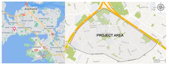 Te Ara Mua is a controlled before–after intervention study of neighbourhood street changes to make walking and cycling safe and easier, and reflect the cultural identity of Ngā hau Māngere known today as Māngere, in Auckland, New Zealand. At the core of the project was the hypothesis that, in suburban communities, a wide range of social and health benefits can accrue by increasing active transportation, (e.g., walking or cycling), by retrofitting environments to safely promote active travel, and conversely de-prioritising private motor vehicle travel. The evidence supporting this study, the collaboration design of the intervention, and the research study design have all been previously published [,]. Both placemaking and transport infrastructure strategies were employed. Project outcomes included ensuring that streets and lanes were accessible and user friendly to walk through, and the best thoroughfares were also attractive destinations in their own right. The project setting, Māngere, comprises of 70,959 [] residents of which 60% identify to a Pacific Islands ethnic group, followed by 20% European, 17% Asian and 16% Māori (includes all people who stated each ethnic group, whether as their only ethnic group or as one of several) []. While Māngere is a predominantly Pacific Island community, the first peoples are Māori represented by the mana whenua of Te Ākitai Waiohua and Te Ahiwaru Waiohua []. Other mana whenua groups for Māngere and the wider Tāmaki Makaurau region include: Ngāti Whātua Ōrākei, Ngāti Te Ata, Ngāti Pāoa, Ngāi Tai and Kawerau-a-Maki []. It is important to note that while tribal identification of mana whenua within Tāmaki Makaurau is relatively straightforward, identifying set tribal land boundaries is more complex. Similar to other tribal groups globally, there remains unresolved mana whenua histories of inter-tribal land disputes. In this regard, project settings and inclusion of relevant residing mana whenua groups is often more inclusive rather than exclusive. Figure 1 identifies the project boundaries of the site.