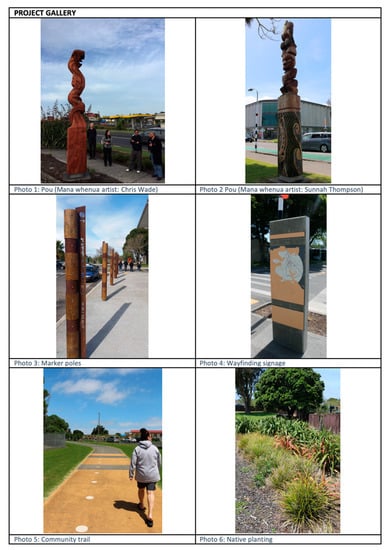The physical environment of the intervention area and the visual design outcomes were reviewed (photographs supplied—see Figure 3) by all respondents. These photographs of the project design outputs were utilised as prompts or reminders of the tangible project outcomes and their placement within the community of Māngere, including native planting and public artworks. The visual outputs were explained and praised by each respondent as they described their personal design and development experiences in the Te Ara Mua project. Respondents commented that Māori public artworks remain an effective and crucial method of promoting Māori presence in place. Reflecting on the project pou, respondents noted they were crucial public acknowledgements and statements of local iwi, and a means of anchoring Māori to place. The notion of anchoring was explained by Mei that “It’s an important part to iwi, hapū, and whānau wellbeing being able to see yourself reflected back in the public realm and anchoring your identity through whakapapa (genealogy) in your special place in the world.” Wider community stakeholders, Yoko and David, viewed pou as tributes to celebrate Māori and their historical presence. Local resident, Chris explained that his pou had personal significance for his whānau and iwi, “they were really proud, because they had their ‘own’ doing those carvings. You could see it on their faces … they looked really happy … it was [a] good thing for the families.” Other respondents noted that Māori public artworks also contributed to increased cultural education, ownership and connection to place for all community members. This interrelated concept was detailed by Mei:
