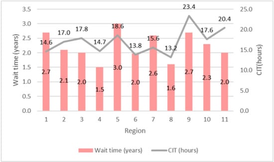 Average wait time and cold ischemia time across 11 regions in US (2019).