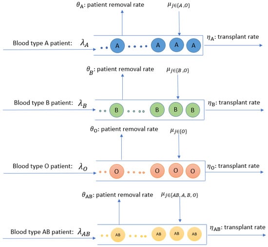 Each competitive patient group is modeled by a queue related to blood type j where . Patients can join their matched queue (e.g., based on blood type) with the rate of and get served by compatible donors. Compatible kidneys arrive at the blood type j queue with a rate of . For instance, for the blood type A queue, compatible kidneys are of types A and O. Patients depart from the waitlist j with a transplant rate of when (1) they accept an offered kidney, or (2) with a rate of they either get too sick for transplantation or die on the waitlist. The structure of the queuing model is shown in Figure 4.