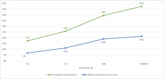 To illustrate the effect of improved information sharing, we report the results for patients of blood type A in region 6. We initialize the waiting list with 1000 patients and run the simulation until the waitlist length stabilizes around 1800 patients (200 months). We report results after this warm-up period averaged over 300 months. The baseline is the currently used group size of . We vary g to represent varying levels of information sharing.