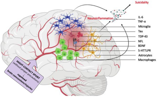 Moreover, such microscopic injuries in the central nervous system can trigger neuroinflammatory processes that are orchestrated by microglia, astrocytes, and macrophages (in the context of compromised blood brain barrier integrity) [57] (Figure 3). Upon recognition of these abnormally expressed protein aggregates, these cells elicit a robust inflammatory reaction, characterized by the release of cytokines and chemokines to amplify and sustain this response. Such inflammatory milieu might potentiate the risk for SI and SB as they have been convincingly shown to be positive correlates of suicidality [58,59]. In this regard, patients with SA exhibit high levels of several inflammatory markers, such as IL-6 and TNF-α [60,61], all of which were found to be elevated in the cerebrospinal fluid of subjects with traumatic brain injuries [57,62].