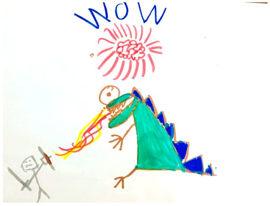 The subjects were randomly assigned to three groups: (1) with Mind Map stimulation, (2) with Sketchnoting, and (3) the Control group. Parents whose children were included in the experimental groups were informed that their children took part in metacognitive training aimed at strengthening executive functions and reducing ADHD symptoms. They were informed that in the classroom, the children would learn one of two strategies used in such training. In turn, the parents of children from the Control group received information that they were waiting in the queue for their children’s participation in training for about 3 months and after that time they would be invited by the researcher to re-test and train (which is not the subject of these studies). It is worth noting that the reported children were assigned a number on a current basis and then, using a number generator, they were randomly assigned to the Mind Map, Sketchnoting or Control group. Participants of the experimental groups had 25 individual thematic classes, twice a week, for a period of three months. Children from the Control group did not undergo metacognitive training. Each participant was examined twice, at the beginning and at the end of the training (experimental groups), and three months after the first measurement (Control group). That was the duration of the training. Training with the use of two metacognitive strategies had a clearly defined goal and course of each meeting. It was based on the Kolb series, so the classes began with a short introductory exercise, which allowed the children to reflect, which was supplemented with the necessary theory by trainers. The last step was closed with the exercise that gave the children the opportunity to perform it in accordance with the acquired knowledge and skills. At each stage, the children drew fragments of Mind Maps or sketchnotes in accordance with the topic of subject classes. Classes were conducted individually with each child by three trainers in 25 thematic meetings: (1) detective, (2) Mind Map/drawing of my life, (3) principles of Mind Map/sketchnote, (4) principles of classes, (5) senses, (6) wonders of the world, (7) my dream day, (8) self-presentation training, (9) friendship, (10) animals, (11) weather phenomena, (12) cosmos, (13) strange tools, (14) fairy tales, (15) board game, (16) illusions, (17) role model, (18) sports, (19) holidays, (20) water experiments, (21) competitions, (22) food, (23) fashion, (24) explorers, (25) summary. Each of the trainers followed the previously written procedure. It is worth emphasizing that the research team consisted of 100 academic students, who were systematically rotated during classes with children, so as to minimise the impact of relations with trainers. An example of the procedure for creating a Mind Map for a topic “role model” is given below. the Mind Map (Figure 1) consists of five main roots. The first (in the upper right corner) is the goal of the lesson. The children write out in single words the agenda of the meeting, which was presented by the trainer. In the case of the “role model” classes, the participant wrote: knowledge of who is role model, features role model, examples of my role models. The second root was related to the definition of a role model, which the child created on the basis of the exercise in which he participated. According to the trainee, the role model is a trusted person, a person who is respected, a person who is worth following, a person who is a leader. The third root concerned the emotions evoked by the role of the model: joy, security, lack of fear, lack of anger. The fourth root was distinguished by the characteristics of a role model: according to the child, the role model should be nice and wise. The last root presents the roles of the participant models—these are: parents, sister, and girls from the Catholic University of Lublin (CUL), who are the trainers conducting the training. In the case of children who participated in the Sketchnoting group, the lesson procedure based on the Kolb’s cycle was the same. The only difference was drawing (possibly without using words). In the example of Figure 2, the participant drew a sketchnote that symbolically combined the entries recorded on Mind Maps (children, under the influence of the same exercises, came to similar conclusions). In the research participant’s concept, a knight with a shield is the embodiment of a role model (brave, strong, worth imitating). The knight finally defeats the dragon (personification of problems) with knowledge, wisdom (drawing of the brain). It arouses general admiration and the will to imitate (exclamation “Wow”).