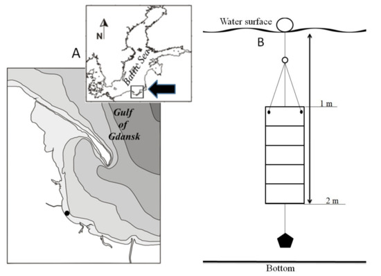 (A) Location of the station where the culture panel was exposed to the waters of the Gulf of Gdańsk. Inset shows the location of the Gulf of Gdańsk in the Baltic Sea. (B) Diagram of the culture panel exposed to the waters of the Gulf of Gdańsk.