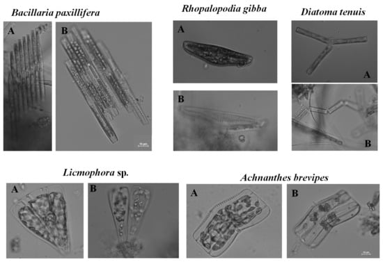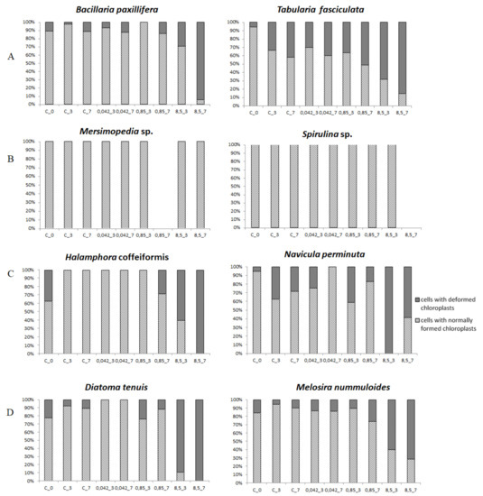 Studies conducted on communities of freshwater periphyton indicated that natural communities adapted to stress factors, such as toxic substances, by altering community structure through the robust development of cyanobacteria and the inhibition of diatom growth [49]. Our observations in the current experiment were identical. Additionally, during the study we also examined the condition of chloroplasts, which indicated that usually advanced degradation only occurred at the highest concentration of 8.5 g·dm−3 (i.e., in Halamphora coffeaeformis, Bacillaria paxilifera, Diatoma tenuis, and Melosira nummuloides).