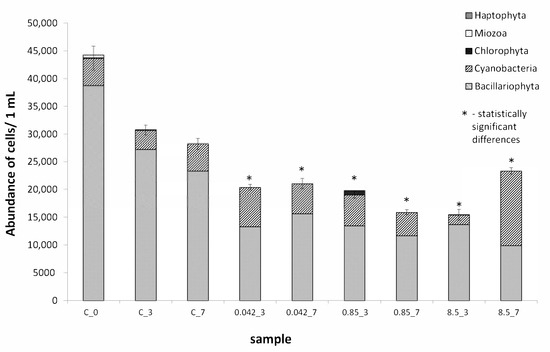 The microphytobenthos assemblages analyzed were dominated by diatoms, which constituted from 65 to 88% of all the cells counted (in the control solution on day three). Only on day seven at a concentration of 8.5 g·dm−3 did they account for 43% of total abundance. The abundance of cyanobacteria in the control solution did not exceed 18% (the most were observed on day seven of the experiment), while at concentrations of 0.042 g·dm−3 and 0.85 g·dm−3 they constituted from 26 to 35% of total abundance. The most cyanobacteria were observed on day seven of the experiment in the solution at a concentration of 8.5 g·dm−3 at 57%.
