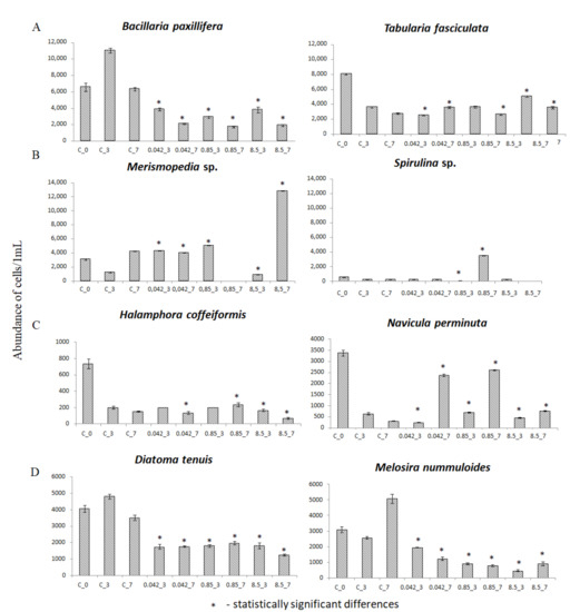 During the experiment, a total of 58 microalgae species was identified, including 45 diatom, nine cyanobacterium, and two green alga taxa and representatives of Myzozoa (Peridinium sp.) and Haptophyta (Prymnesium sp.). The full list of taxa identified is in Appendix A (Table A1). Appendix A (Table A2) presents the mean abundance and standard deviation of selected taxa.