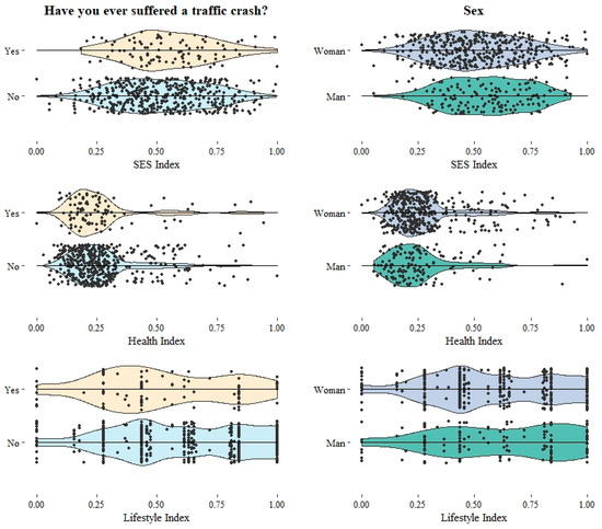 Finally, Figure 1 shows a violin plot for the indices that display the variables’ distribution depending on the reported crashes and on the sex variables (as an example of the possible distributions the indices could have across the participants’ features). The figure allows us to visualize the predictive power of the indices, observing that the lifestyle index is the one adjusting to the data curve in the most adequate way.