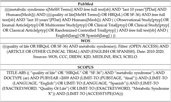 The search was conducted by the first author (A.M.D.) in March 2020. The search criteria for the three databases are detailed in Figure 1. The databases used were PubMed, WOS, and Scopus. Articles published in open access in the last 10 years and limited to English and Spanish language were selected. The terms: (metabolic syndrome x) AND ((quality of life OR HRQoL) OR SF-36)) were linked by logical operators. Observational, longitudinal, and clinical trials were included.