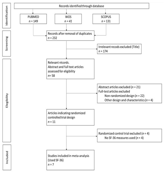 The electronic search identified 321 publications (Figure 2). We used three different databases that, when combined, found 89 duplicates, which were then excluded. The titles of the 232 remaining publications were reviewed, and 174 articles were found not to fulfill the inclusion criteria and were excluded. There were 58 relevant records, of which the abstract and full text were reviewed. Of these, 21 were excluded after reading the abstract because they did not fulfill the inclusion criteria. The full text articles reviewed included 22 non-randomized design studies and four that were of other designs and characteristics; these were excluded. Among the remaining 11 publications, four did not use the SF-36 questionnaire, two of which also had a high risk of bias (Table 1) [18,19,20,21,22,23,24,25,26,27,28]. Table 2 provides a detailed overview of the seven RCTs selected for meta-analysis, including information about the intervention(s), control treatment, study duration (weeks), percentage female, MetS criteria, mean age, and sample size. The earliest published study included was from 2015. Four of the studies were conducted in Asia (57.1%) [18,23,26,27], two in North America (28.6%) [19,22] and one in South America (14.3%) [24]. The study duration lasted from 12 to 36 weeks and the average participant was 54.7 years old. In addition, two studies were conducted on only male participants [22,23], while the remainder included both sexes. The total number of participants was 637, and all participants had at least two criteria for MetS. Interventions were described as lifestyle and exercise intervention, and control treatment was described as general information about nutrition and physical activity, or maintaining their current daily activities and exercise habits. For those studies with three comparison groups, their characteristics were evaluated to choose the intervention group to be included in the meta-analysis. In the case of Chiang et al. and Saboya et al. [23,24], the intervention group selected was the one that was subjected to an individualized and proactive intervention. For the Taylor et al. study, the two intervention groups were analyzed as one, according to the authors’ criteria [22]. All studies reported results for both the physical and mental health components of SF-36.