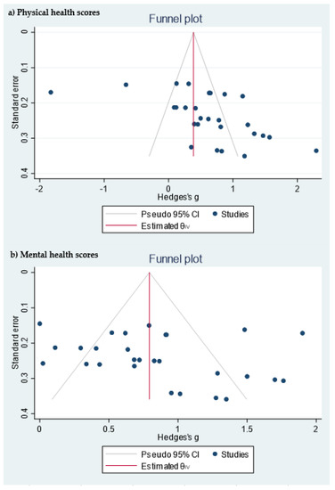 For each outcome measure from SF-36, Hedges’ g and 95% confidence intervals (CIs) were calculated to assess the change in the experimental group compared to the control group. I2 statistics and 95% CIs were calculated to determine the degree of heterogeneity [30,31,32]. Possible publication and small study biases were assessed visually using funnel plots of the Hedges’ g against their standard errors, and then tested formally using Egger’s test [33]. All statistical analyses were performed using StataCorp 2019 (StataCorp LLC: College Station, TX, USA).