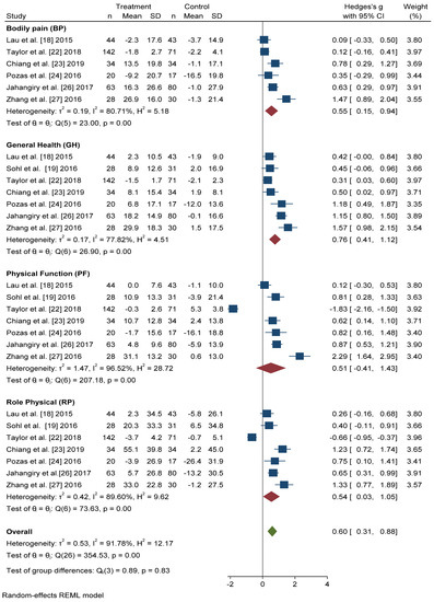 The differences in Hedges’ g for Bodily Pain (BP) between the intervention group and the control group was 0.55 points, 95% CI = 0.15–0.94, I2 = 80.71%, 95% CI = 52.06–90.14. We also found significant improvements in the scores of Physical Function (PF) (Hedges’ g 0.51 points, 95% CI = −0.41–1.43, p < 0.001, I2 = 96.52%, 95% CI = 95.65–98.07) and Role Physical (RP) (Hedges’ g 0.54 points, 95% CI = −0.03–1.05, p < 0.001, I2 = 89.60%, 95% CI = 85.77–95.33) in the active intervention compared with the control group.