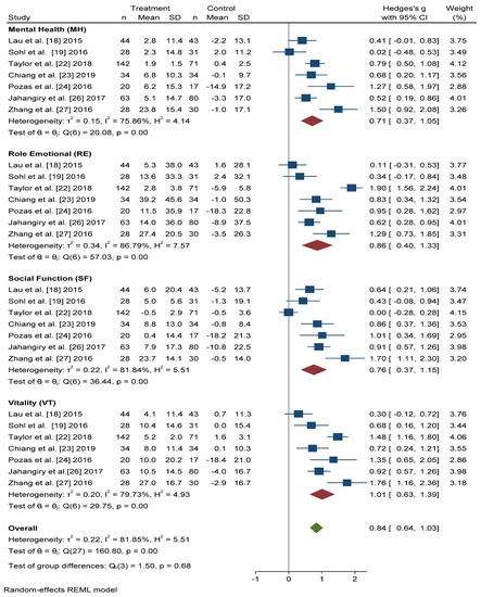 For the Role Emotional (RE) domain, better results were also obtained in the intervention group than in the control group (Hedges’ g 0.86 points, 95% CI = 0.40–1.33, I2 = 86.79%, 95% CI = 80.84–94.22). The Vitality (VT) domain score improved, to a greater extent, in actively treated subjects compared with the control group (Hedges’ g 1.01, 95% CI = 0.63–1.39, I2 = 79.73%, 95% CI = 58.83–90.12).