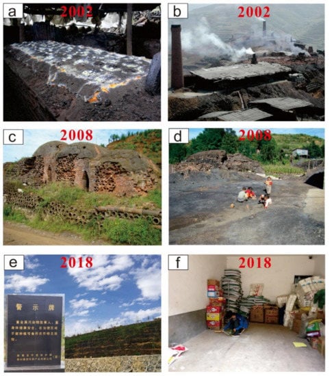Dynamics of the indigenous zinc smelting (IZS) in Hezhang, Guizhou. (a and b, IZS activities in Hezhang before 2006; c and d, closed IZS furnace and slag piles in 2008 two years after the complete ceasing of IZS; e, Disposed zinc smelting slags after the 2010s; and f, ground dust collection in residential houses in 2018).