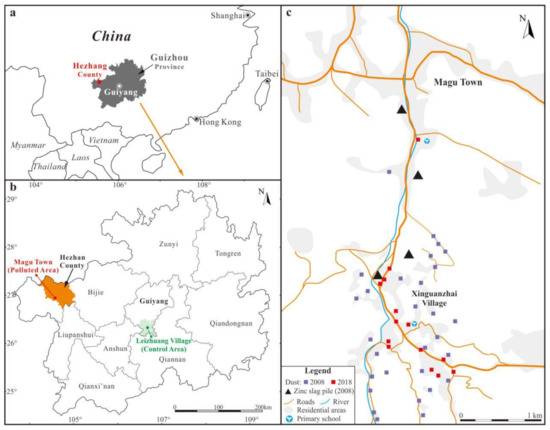 In this study, Xin-Guan-Zhai village was selected as the zinc smelting impacted area (Figure 1 and Figure 2) and Leizhuang village in suburb Guiyang was selected as the control site, which experiences a similar climate in comparison to the Xin-Guan-Zhai village (IZS area) but has no IZS or other direct heavy metal point contamination sources. The control site of Leizhuang is located in the southwest of Guiyang city, the capital of Guizhou province, ~35 km away from the city center and ~300 km away from the IZS area. Magu town experiences a subtropical monsoon climate with an average annual rainfall of 900 mm and an annual average temperature of 12.5 °C. The total area of Magu town is 141.93 km2, with a lowest and highest elevation of 1775 m and 2588 m, respectively. Corn is the predominant agricultural crop in the study area, which accounts for 45–55% of the total annual production, followed by rice, potatoes, wheat, and soybeans.