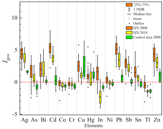 The results suggested that the concentrations of over a half element (Zn, Pb, Cu, Cd, Ag, As, Sn, and Sb) in dust samples were linked to the IZS activities since the significantly decreased values in 2018 were compared to those in 2008 (Table 1). A similar trend was observed in Avilés [45], an industrial area in Spain, where some industrial activities have declined, with concentrations of Zn, Cd, Hg, Ag, and As in ground dust decreasing over time (1996–2001, 2001–2006) in four surveys (1996, 2001, 2006, 2011). Although zinc smelting has been banned for many years in the study area, its impact last a long time, as shown by the excess background values in varying degrees in the following ascending order: Tl, Sn, As, Hg, Cu, In, Sb, Bi, Ag, Cd, Zn, Pb. High concentrations of Zn, Cd, and Pb were also observed in the street dust in Huludao City that was impacted by the large-scale Zn smelting activities [22].