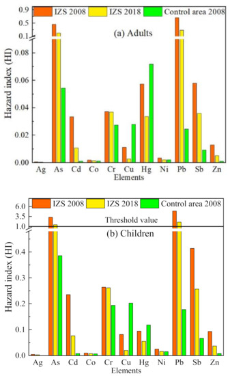The hazard index (HI) of non-carcinogenic risk of metal(loid)s in ground dust to residents is shown in Figure 5. The value of HI <1 indicates a negligible non-carcinogenic risk to residents, whereas when HI >1 there is a concern for non-carcinogenic health effects [37]. For adults, there was no risk of multiway exposure in both the IZS area and the control site (Figure 5a), whereas the situation for children was not optimistic (Figure 5b). In 2008, the HI values of As and Pb for children were 3.31 and 4.86, respectively (Table S4), with values far exceeding 1. Despite the significantly decreasing heavy metals concentration in dust samples, the HI values of As and Pb in 2018 were still over the acceptable value (1.43 for As, 2.09 for Pb) (Table S5), indicating that As and Pb posed non-carcinogenic health risks to children even a decade after the termination of IZS. Furthermore, the HI of children was 2–7 fold higher than that of the adults in most cases (Tables S4–S6), suggesting that children were more susceptible to similar exposure levels. This is due to the fact that children have frequent hand-to-mouth behavior, lower body weight, closer proximity to the floor and different metabolisms compared to adults. The contribution of different exposure routes was ranked as follows: ingestion > dermal contact > inhalation for both adults and children (Tables S4–S6). This sequence applies to all elements in this study with one exception (Hg); the inhalation of Hg vapor was the principal exposure route instead of particulate matter, which agrees with the previous study [54]. The results demonstrated that As and Pb were the most important pollutants in ground dust of the IZS area that posed a non-carcinogenic health risk to residents, especially children. Thus, the potential health risks to children resulting from exposure to ground dust cannot be neglected.