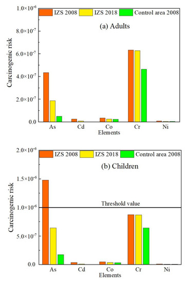 Figure 6 shows the carcinogenic risk of exposure to As, Cd, Co, Cr, and Ni in ground dust. The corresponding data is listed in Table S7. The risk decreased in the following order: As≈Cr>> Co> Cd> Ni. For adults, the calculated risk for all these five elements did not exceed threshold value (10−6–10−4) [55] in the IZS area both in 2008 and 2018. Although the levels of As and Cr for children were somewhat higher than those for adults, Cr was still in the acceptable value range. However, As represented the risk of 1.48 × 10−6 in 2008, indicating an unacceptable carcinogenic risk. For both subpopulations, the carcinogenic risk of Cd and Co exposure (10−8–10−7) fell below the threshold, and the risk of Ni exposure was within the lower range of 10−8–10−9. It suggested that Cd, Co, and Ni exposure pose a negligible risk. Although there is an obvious disparity in the results for the IZS and the control area, the carcinogenic risk of exposure to five metals in ground dust was generally low, with As for children as an exception.