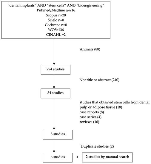 Bibliographic research was carried out in the Pubmed/Medline (NCBI), Cochrane, Scielo, Web of Science (WOS), Cumulative Index to Nursing and Allied Health Literature (CINAHL), and Scopus databases. The research was performed until October 31, 2020, without applying restriction on the publication date. Articles that contained information about the use of stem cells obtained from the bone marrow for bone regeneration in the jaws were searched. The following Mesh terms were used combined with the Boolean operator “AND”: “dental implants” AND “stem cells” AND “bioengineering”. With this search strategy, all titles and abstracts found were evaluated and the bibliography of selected studies and other reviews was revised to include other relevant studies in our review.