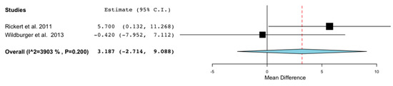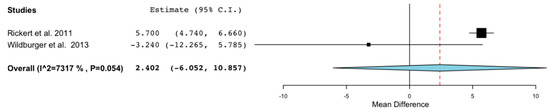 Regarding the analysis of the percentage of residual BioOss® at 3–4 months, this is analyzed by two studies [23,24] composed of 25 patients and 36 regenerations. The result shows us a difference in favor of the control group (WMD: 2.402; 95% CI: −6.052 to 10.857, p = 0.578 and heterogenicity: I2 = 73.17%, p = 0.054) (Figure 4).