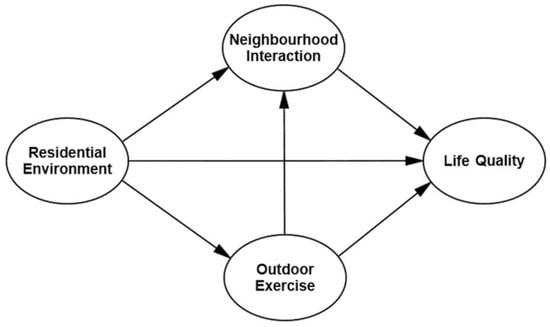 For older adults who live at home, most of their daily activities are carried out in their residential environments. Among the activities, outdoor exercise (personal behavior) and interaction with neighbors (social behavior) are considered to be the most important individual behavior modes that influence the health and well-being of older adults [23,24,25,26,27]. Therefore, the social ecosystem of older adults’ residential area is composed of many factors including the older adults themselves, the residential environment, the individual behavior (including outdoor exercise, neighborhood interaction) and the well-being of the older adults. It not only emphasizes the important role of the residential environment on the well-being of older adults, but it equally emphasizes the joint role of the individual behavior of older adults in this ecosystem [3,6]. Drawing from the above analyses, it is our assumption that the impact of the residential environment on the life quality of older adults does not exist in isolation. Rather, it exists through the intermediary role of neighborhood interactions and outdoor exercise. Therefore, we constructed a social–ecological model of “residential environment–individual behavior–life quality relationship of older adults”, as shown in Figure 1.
