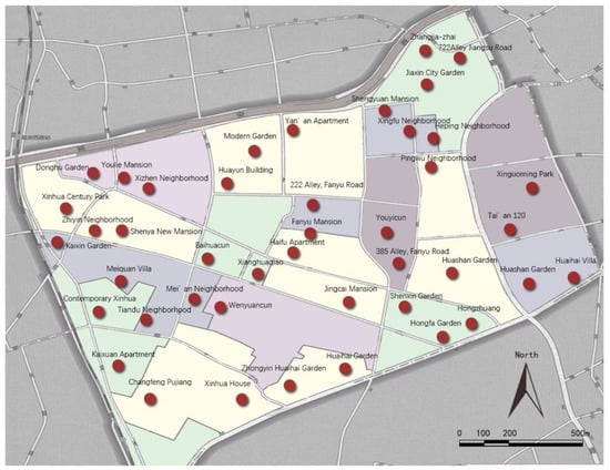 The representativity of the sampling principles for residential districts was enhanced in a number of ways: (1) The equilibrium of the geographical location. The selection of residential district samples was, as much as possible, aimed at achieving a balanced geographical distribution within Xinhua Street. (2) The diversity in the years of construction of the residential districts. Samples of selected residential districts built between the 1980s to the 2000s. (3) The diversity of housing types. The samples covered as many housing types as possible, including, for example, low-rise, multi-storey, and high-rise buildings, as well as brick–concrete, reinforced concrete, and steel structures. Finally, as shown in Figure 2 and Figure 3, a total of 43 residential districts were selected from 198 residential districts in Xinhua Street.