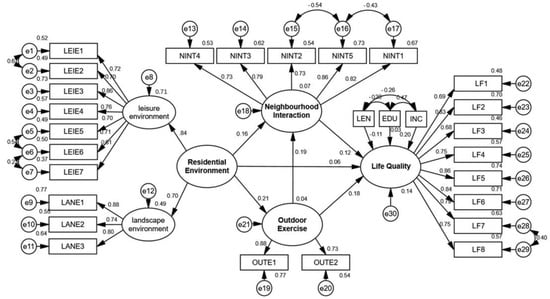 A multiple-factor confirmatory analysis was utilized in the measurement models of leisure environment, landscape environment, neighborhood interaction, outdoor exercise and life quality. It was observed that the factor loads of three observation variables, including maintenance degree, acoustic environment (in the landscape environment measurement model) and religious belief (in the quality of life measurement model), were below standard (0.6). Following the deletion of these three observation variables, the multiple-factor confirmatory analysis was performed once again. Finally, the factor load of all the observed variables was greater than 0.6 [38], and all the measured models had good reliability and validity. The correlation coefficient of landscape environment and leisure environment was 0.627. Therefore, the landscape environment and the leisure environment together constitute the second-order model of the residential environment.