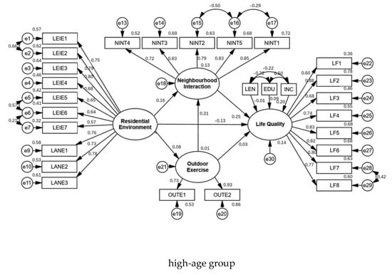 The data of low-age, middle-age and high-age groups were substituted into the model for group comparison. The fitting result of the high-age group model showed that the fitting result of the second-order measurement model of the residential environment was faulty, and the factor loading of the landscape environment exceeded one. Therefore, the high-age group model was modified to integrate the measurement model of the landscape environment and leisure environment into one variable, and thereafter, the model was re-fitted. This resulted in an adequately fitting result, as presented in Figure 5.