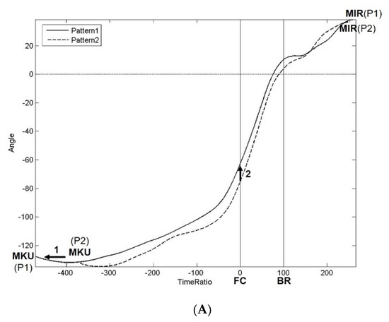 The curves of mean pelvic angle of Pattern1 and Pattern2 related to time ratio from MKU to MIR and those of trunk are shown in Figure 4A,B. The curves of mean TPS of Pattern1 and Pattern2 related to time ratio from MKU to MIR are shown in Figure 4C. It can be noted that Pattern1 and Pattern2 have different mean time ratios of MKU, MIR, AC1, and AC2.