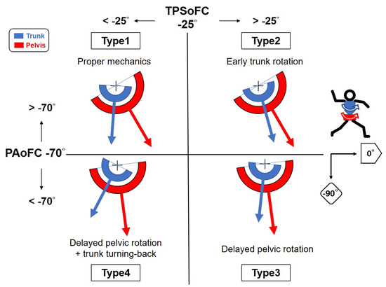 In accordance with the results and characteristics identified in this study, a new quantitative method with the use of “PAoFC” and “TPSoFC”, instead of “expert decision”, was developed. Pelvic and trunk rotational pitching mechanics can be classified into four types. Type1 (proper mechanics) yields significantly higher ball speeds than the other three types and is thought to feature adequate energy transfer, from the stride foot to the throwing upper limb. Types 2–4 are regarded as “improper mechanics” that result in slower ball speeds and less efficient energy transfer. The qualitative approach based on “expert decision” can identify proper pelvis and trunk rotational mechanics. However, quantitative analysis is more precise in identifying three improper types of pelvis and trunk rotational mechanics.
