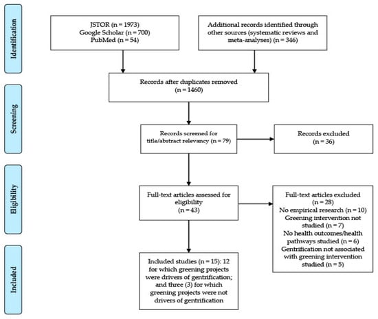 Articles with study populations throughout the world were eligible for inclusion. Due to inconsistent language for green-induced gentrification, we considered as eligible a range of terms (e.g., green gentrification, environmental gentrification, ecological gentrification, green climate gentrification, and climate gentrification). The most common reasons for exclusion at the final stage of evaluation (n = 43 to n = 15) were that the articles addressed gentrification without referencing green-induced gentrification or that articles focused on green gentrification but did not consider health, well-being, or health pathways.
