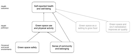 Several of the research areas described through our main findings (Section 3.2, Section 3.3, Section 3.4, Section 3.5 and Section 3.6) have clear connections established (see Figure 2). Specifically, the research areas are represented through rectangles, whereas their connections are depicted through arrows. We established that those connections existed either because they were evident in the 15 studies included in our review or because they have been established in the literature about green space and health. For example, articles in our review showed connections between green space safety and use [36,40,45] and between sense of belonging and green space use [35]. Also, numerous other studies link higher green space use to better health outcomes as well as green space improving air quality, which in turn leads to better health [31,48]. We also organized the research areas we identified into three levels. On the lower part of the map, we included elements of the perceived and social environment, which are social determinants of health listed in ecological models of health [49]. In the middle of the map, we depicted health pathways such as physical activity, while health outcomes are represented at the top of the map and include self-reported health.