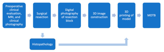 As image-guided navigation technology continues to emerge in head and neck surgery, we believe that AM can serve a similar purpose. Our objective was to develop a simple, replicable process of 3D modeling and printing resected oral tongue and tongue base tumors. These models would then be used at MDTB meetings to facilitate interdisciplinary management (Figure 1). Digital photography enabled us to efficiently construct a 3D image of the resection block, which was then printed to create a tangible model of the tissue. Like the coordinate map used in image-guided surgical navigation, this model optimizes visualization and understanding of tumor topography, location, and orientation. For example, pathologists could use the model as a tool to present exact margin locations. While postoperative 3D tumor modeling has not been well studied in head and neck literature, we believe it merits further investigation given the efficiency of the process (as short as 1 or 2 days from surgery to printing), growing availability of AM technology and related open-source software, and developing need for non-invasive procedures that mitigate surgical risks. Future directions in developing our method may include using a 3D scanner instead of photography and comparing the accuracy of different methods. While photography is inexpensive and widely available, 3D table scanners have become more advanced and accessible and have been used in 3D soft tissue tumor modeling [27]. Using a scanner may affect the speed and accuracy of the 3D modeling process.