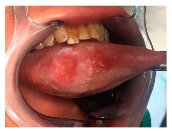 Preoperative image of Case 2 showing squamous cell carcinoma of the right mobile tongue.
