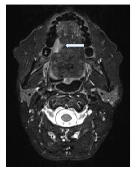 T2-weighted fat-suppressed, contrast-enhanced MRI of Case 2 in the axial plane. Squamous cell carcinoma indicated by arrow.