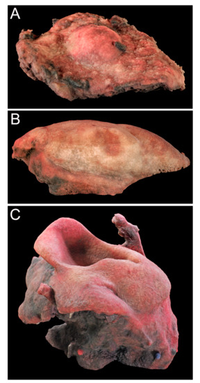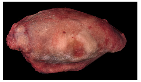 Digital and physical models of the surgical resection block were produced within one week of the operation. The 3D model dimensions were scaled up from the true dimensions of the resection block due to the small size of each tumor. Enlarging the dimensions of the model allowed for improved visualization of surface topography and anatomical details. For Case 1, the model produced by binder jetting conveyed more information than the material extrusion model because of the added color texture made possible by binder jetting (Figure 7 and Figure 8). Using material extrusion, the model was made of simple ABS-like white polymer with less detail.