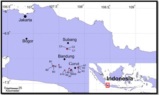 - Iskandar, I.; Dermawan, F.A.; Sianipar, J.; Suryantini, Y.; Notosiswoyo, S. Characteristic and Mixing Mechanisms of Thermal Fluid at the Tampomas Volcano, West Java, Using Hydrogeochemistry, Stable Isotope and 222Rn Analyses. Geosciences 2018, 8, 103. [Google Scholar] [CrossRef]