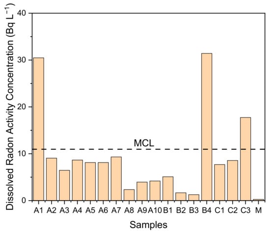 - Trautmannsheimer, M.; Schindlmeier, W.; Boerner, K. Radon activity concentration measurements and personnel exposure levels in Bavarian water supply facilities. Health Phys. 2003, 84, 100–110. [Google Scholar] [CrossRef]