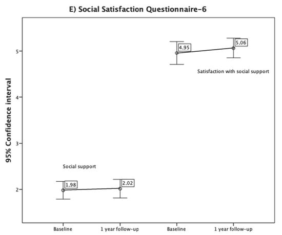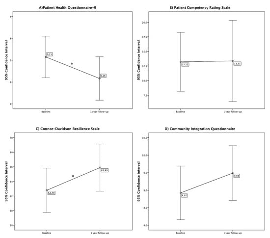 Confidence interval plots for the scores in (A) Patient Health Questionnaire-9 (PHQ9), (B) Patient Competency Rating Scale (PCRS), (C) Connor–Davidson Resilience Scale (CD-RISC), (D) Community Integration Questionnaire (CIQ), and (E) Social Support Questionnaire-6 (SSQ6) in baseline and 1 year follow-up (Note: * p < 0.05 in paired t-test analysis).