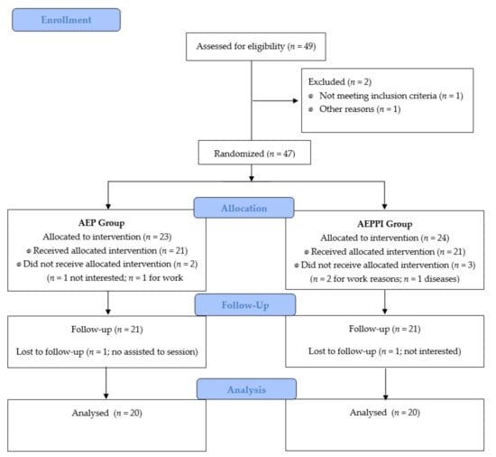 Flow diagram of participants. AEP, Abdominopelvic exercise program; AEPPI, Abdominopelvic exercise program adding postural instructions.