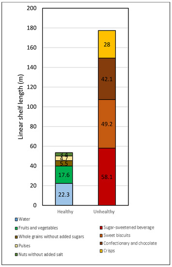 Table 3 and Figure 2 show the average linear shelf length devoted to healthy and unhealthy foods and their ratio. Overall, the average shelf length was 53.4 m for healthy foods and 177.4 m for unhealthy products. This means that for every 1 m of shelf length for unhealthy foods, there was a shelf length of about 25 cm for healthy foods.
