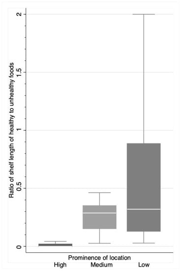 Median ratio of shelf length of healthy to unhealthy foods by prominence location in supermarkets in the City of Buenos Aires (n = 32). Box squares represent 25th and 75th percentiles. Kruskal–Wallis test (p = 0.003). High prominence areas: checkout side and checkout end and aisle endcaps that face the checkouts or the center of the store. Medium prominence areas: endcaps that face the back or the perimeter of the store, aisles and islands. Low prominence areas: edges.