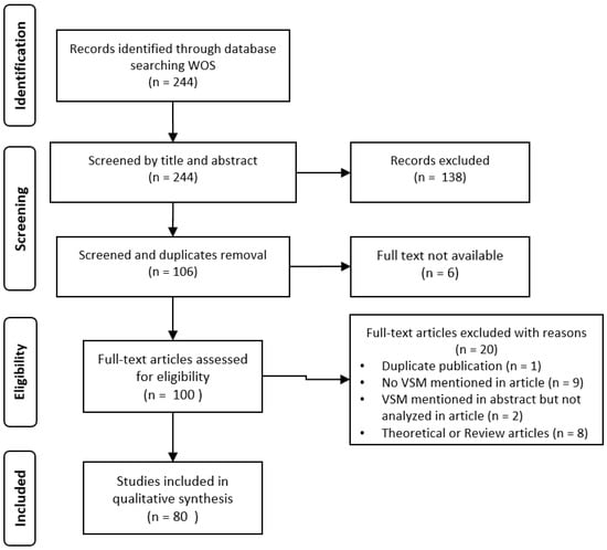 Integrating published knowledge is a vital contribution to the development of the scientific field [13]. It allows researchers to know, on the one hand, the real evidence currently available and, on the other hand, which limitations impact the available published research and the possible research niches that future research can deal with. Indeed, in relation to VSM, our research will provide researchers with a list of recent fieldwork done on this theme and we help to verify if the demand of studies on this matter has been covered according to previous literature reviews [8,14].