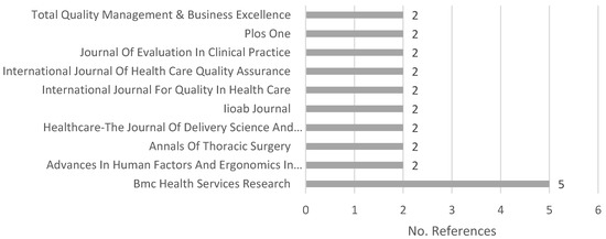 As shown in Table 1, 67 different sources appeared in our sample. Figure 3 shows the 10 journals with the most published articles. The journal BMC Health Services Research stands out in the set of sources with five articles about the subject, followed by nine journals with two publications each on this subject. The 57 remaining sources in the sample only presented one publication on the subject of our review for the 2015–2019 period.