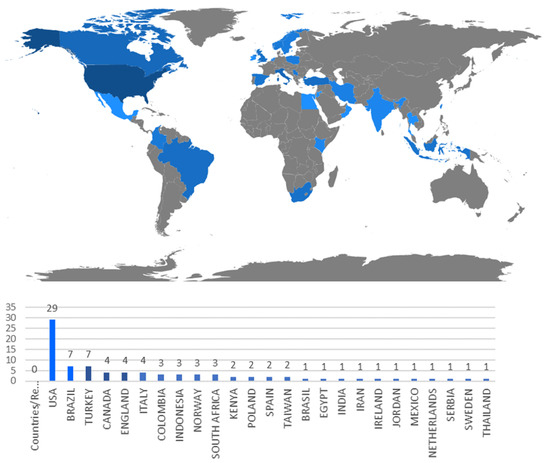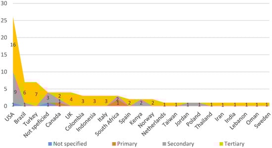 Figure 4 presents the number of references per country of the main author. According to Figure 4, the USA is the leading country as it is the country in which more references are published according the affiliation data of the main author. It is followed at a considerable distance by Brazil and Turkey with seven works, and then by the UK, Canada and Italy with four. All the other works are distributed among the other countries.