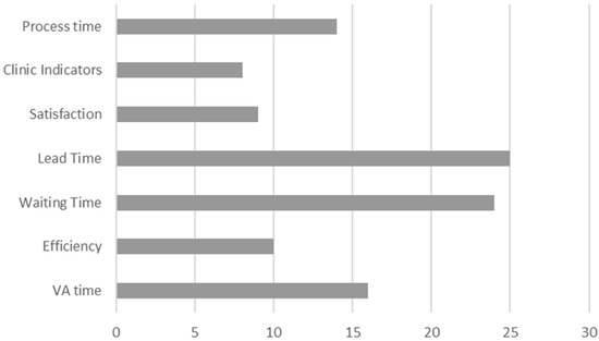 One of the main goals pursued with the VSM is to improve some key performance indicators (KPI) of the organization. In this work, we are going to group them into three main pillars: operational, environmental and social indicators [25,26,27,28,29]. For example, for operational indicators, among others, the following have been used [24,29,30,31,32]: clinical quality, cost reduction, patient safety, organizational responsiveness, lead time, delivery performance, process time, inventory level, equipment performance, reducing delays, error rate, service quality and patient satisfaction, and for environmental indicators [26,30]: waste reduction, energy consumption, resource reduction, carbon footprint, carbon value efficiency and fossil fuel reserve emissions. Finally, some examples for social indicators are [30,33,34,35]: employee well-being, work–life balance, employee satisfaction, work accidents, turnover rate, etc.